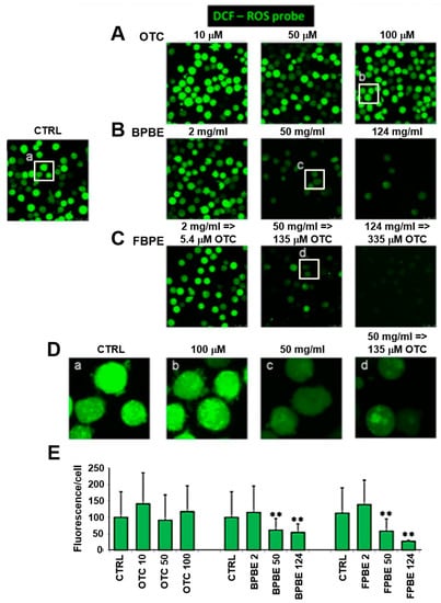 The mitochondrial respiratory chain is the major source of reactive oxygen species (ROS) in the cell which are generated by electron leak directly to oxygen with the production of the superoxide radical anion O2•- further converted to H2O2, by the mitochondrial superoxide dismutase, and in this form diffuses outside the organelle [28,29]. On this basis, we monitored the production of cellular ROS as an indirect measure of the respiratory activity by the peroxide sensitive fluorescent probe dichlorofluorescein (DCF) [30]. As shown in Figure 5, both BPBE and FPBE treatment caused a significant reduction in the DCF-related signal at the intermediate and lowest dilutions. Conversely, no changes were observed at all the concentrations of pure OTC tested.