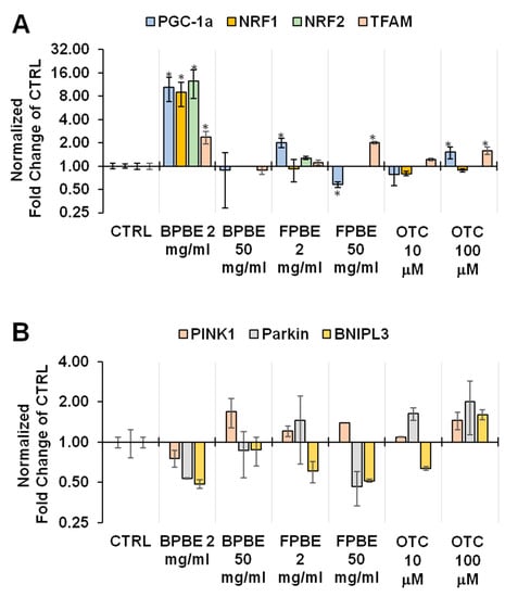 Figure 6A shows the normalized transcript levels of the genes coding for the peroxisome proliferator-activated receptor-gamma coactivator 1-alpha (PGC-1α), a master regulator of the mitochondrial biogenesis and for the mitochondrial transcription factor A (TFAM), a key activator of the mitochondrial genome transcription and replication [32]. Notably, low concentrations of BPBE caused a statistically significant ten-fold increase in the transcription level of PGC-1α, whereas FPBE at the same dilution elicited a smaller two-fold increase of the same transcript although still statistically significant. To support the effect on the PGC-1α transcription observed at low concentrations of BPBE, we also checked the transcript levels of two genes coding for the nuclear transcription factors 1 and 2 (NRF1, NRF2), which are also involved in mitochondrial biogenesis but, in turn, are controlled by PGC-1α [32]. The results obtained show that both NRF1 and NRF2 expression was about ten-fold higher following low-dosage BPBE-treatment as compared with untreated cells. A two-fold increase in NRF2 was also observed at low-dosage FPBE-treatment. At intermediate dilution of both the bone extracts, a sharp decline of the PGC-1α transcript level was observed. Conversely, no significant changes were observed following treatment with the pure OTC at the two concentrations tested. Finally, we measured the expression level of genes coding for factors involved in the mitochondrial quality control, which is a multi-steps process whereby cells activate a selective removal of damaged mitochondria in response to stressing conditions [33]. PINK1, Parkin, and BNIP3L (also known as NIX) are proteins that target mitochondria for degradation into intracellular autophagosomes. Analysis of the transcription levels of these mitophagic factors revealed a complex compound- and dose-dependent profile with a significant 50% reduction in the transcript level of all the three factors only under the condition of low-dosage BPBE-treatment (Figure 6B).
