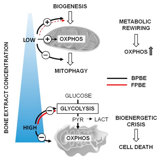 Mechanistically, the observed low-dosage-mediated stimulation of the aerobic metabolism appeared to be linked to changes in the expression of genes controlling the mitochondrial biogenesis and/or the mitophagic removal of the organelles. A combination of these two processes was particularly evident at the lowest concentration of BPBE and FPBE, though to a much lesser extent in the latter. In addition, in this case, the differential transcriptional impact of FBPE treatment cannot be ascribed to antibiotics since pure OTC did not result in significant changes in the transcription profile of the analyzed factors. At higher concentrations of the bone extracts, the stimulatory effect on the mitochondriogenic transcription factors was lost, and other effects prevailed leading to cell sufferance and death.