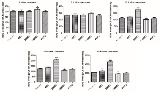 Reactive oxygen species level was measured in CCRF-CEM and A549 cells after 1, 2, 12, 24, and 48 h treatment with Roy, Deroy, Diroy, and Parv. After 12 h of A549 cell incubation with Deroy, the ROS level was higher than that of control cells, and this effect was maintained for up to 48 h (Figure 4). On the other hand, the A549 cells had a lower ROS level after treatment with Roy (Figure 4). For the CCRF-CEM cell line (Figure 5), a significant increase in ROS level was also observed after one hour of incubation with Deroy, and that level was maintained for two hours. It was also found that after 12 h of treatment with Diroy, CCRF-CEM cells had a higher ROS production, and this was still measurable for up to 48 h. Furthermore, after 48 h of incubation with Roy, an increase in the level of ROS was also observed.