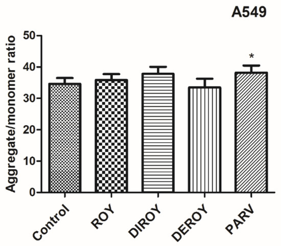 Mitochondrial membrane potential (MMP) is expressed as a ratio of aggregates to monomer fluorescence as quantified with a fluorescent plate reader after 5′,6,6′-tetrachloro-1,1′,3,3′-tetraethylbenzimidazolylcarbocyanine iodide (JC-1) staining. The cells were exposed to Roy (3 µg/mL), Deroy (6.25 µg/mL), Diroy (25 µg/mL), and Parv (1.15 µg/mL) for 24 h. Values are means ± SD. * p < 0.05 cells treated with tested compounds vs. control (untreated) cells.