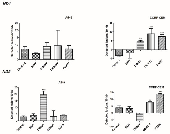 The present study found an increase in lesion rate in the ND5 region: 19.51 lesions per 10 kb DNA in A549 cells treated with Diroy for 24 h and 7.90 and 13.73 lesions per 10 kb DNA in CCRF-CEM cells treated with Deroy and Parv D for 24 h (Figure 9), respectively. Furthermore, a higher lesion rate was observed in the ND1 region in CCRF-CEM cells after 24 h treatment with Diroy, Deroy, and Parv, resulting in 4.46, 8.86, and 7.35 lesions per 10 kb DNA, respectively. No difference was observed in the amount of mtDNA damage in the ND1 region between samples and controls of A549 cells (Figure 9).