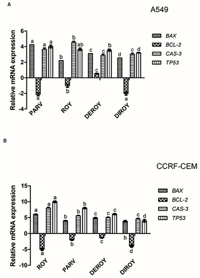 (A) Gene expression (Bax, Bcl-2, Cas-3, and TP53) in A549 and (B) CCRF-CEM cell lines after 24 h treatment with all the compounds: Roy (3 µg/mL), Deroy (6.25 µg/mL), Diroy (25 µg/mL), and Parv (1.15 µg/mL) in A549 cells and Roy (0.7 µg/mL), Deroy (4.5 µg/mL), Diroy (25 µg/mL), and Parv (1.15 µg/mL) in CCRF-CEM cells. The transcript level of each gene was normalized to the expression of a reference gene (18S RNA). Data are presented as a fold change in cells treated with tested compounds vs. untreated, control cells, in which expression levels of the genes were set as 1. The mean values ± SD were calculated in triplicates. The same letter (a, b, c and d) at the same genes is not significantly different at the level of p > 0.05.