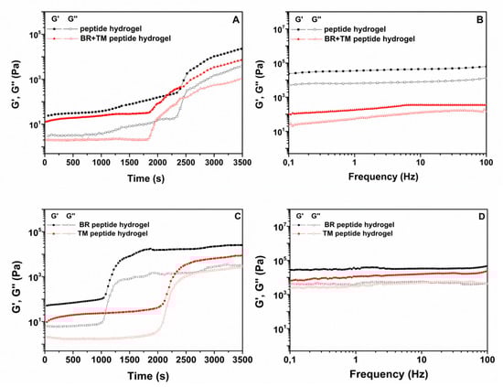 (A), (C). Oscillatory time sweep (0.5% strain, 1 Hz, 37 °C) and (B), (D). frequency sweep experiments (0.5% strain, 0.1–100 Hz, 37 °C) of the ac-(RADA)4-CONH2 peptide hydrogel and the single (BR, TM) and dual (TM + BR) drug loaded peptide hydrogel.