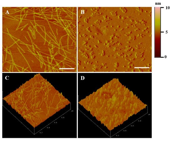 (A,B) 2D and (C,D) 3D AFM images of the ac-(RADA)4-CONH2 peptide hydrogel (A–C) prior and (B–D) post drug loading. Scale bar: 200 nm.