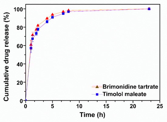 In vitro release profiles of brimonidine tartrate and timolol maleate from the ac-(RADA)4-CONH2 peptide hydrogel in STF pH 7.4 at 37 °C (n = 4).