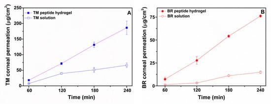 The ex vivo permeability profiles of TM and BR solution and peptide hydrogel formulations across porcine corneas and the respective steady state flux (Jss) and apparent permeability values (Papp) are shown in Figure 4 and Table 2, respectively. TM demonstrated a significantly higher permeability across corneal tissue when loaded within the peptide hydrogel (Figure 4A), with the amount of drug permeated at 4 h being 2.8 times higher for the peptide hydrogel formulation (186 ± 21 μg/cm2) than for the solution form (66 ± 7 μg/cm2). A similar trend was also observed for BR which showed a 5.4-fold higher amount of drug permeation at 4h from the peptide hydrogel (76 ± 1.3 μg/cm2) than from the solution (14.9 ± 1.2 μg/cm2). The Papp of TM in the peptide hydrogel and in solution were calculated to be 2.3 × 10−6 ± 0.3 cm/s and 0.75 × 10−6 ± 0.053 cm/s, respectively. Both values were found to be similar compared to the respective values reported in the literature for TM in the peptide hydrogel (1.91 × 10−6 ± 0.11 cm/s) [11] and in solution form (0.9 × 10−6 cm/s) [24]. The Papp of BR in the peptide hydrogel was calculated to be 3.3 × 10−6 ± 0.3 cm/s, which was almost five times higher than the Papp value calculated for BR in solution (0.63 × 10−6 ± 0.055 cm/s). It is possible that the short peptide nanofibers might act as permeation enhancers by physically perturbing the corneal epithelium to promote drug transport, therefore justifying the significantly higher permeability observed for both drugs from the peptide hydrogel formulation compared to the solution form.