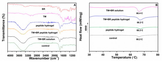 DSC analysis was performed for the detection of possible changes in the structural integrity of the tissues after their interaction with the drug loaded peptide hydrogel during the ex vivo permeability study. The corneal tissue presents a phase transition due to structural changes in the network of collagen fibers in the stroma (unfolding of the structure of the triple helix of the protein) [26]. The thermal decomposition of collagen fibers depends on factors such as the water content of the tissue, the pH of the surrounding medium, the presence of salts, and the degree of interconnection of the fibers. High transition temperatures are associated with increased collagen fiber stability due to possible tissue dehydration [27]. In addition, the development of interactions between the cornea and the evaluated drug formulations may be reflected in the tissue thermograms as changes in the transition point or peak enthalpy [28]. The transition temperature of the intact porcine cornea is located at ca. 66 °C [29]. The thermograms of the corneal tissues treated with the drug loaded peptide hydrogel (Figure 5B) demonstrated a transition peak at 66.2 °C, with negligible differences in peak enthalpy and shape relative to the control sample and the cornea treated with the peptide hydrogel, while the transition temperature of the cornea treated with the TM + BR solution showed a minor shift of the peak at 66.4 °C. In conclusion, the thermal analysis of the tissues confirmed the maintenance of the structural integrity of the corneas treated with the drug loaded peptide hydrogel.