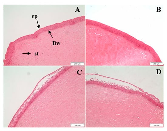 Histological sections of the (A). control (untreated) cornea, (B). cornea treated with the peptide hydrogel, (C). cornea treated with TM + BR solution and (D). cornea treated with TM + BR peptide hydrogel after the completion of the ex vivo permeability studies (ep: epithelium; Bw: Bowman’s layer; st: stroma). Scale bar: 200 μm.