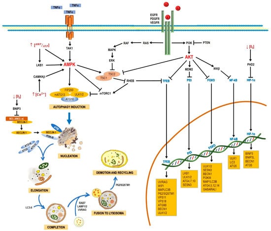 Schematic process of the autophagic pathway. Autophagy consists of the following stages: induction, phagophore nucleation, elongation, and completion; fusion to lysosome, degradation, and recycling. Receptor tyrosine kinases (EGF (epidermal growth factor receptor), PDGF (platelet-derived growth factor receptor), and VEGF (vascular endothelial growth factor receptor)) stimulate the RAS/RAS/ERK and PI3K/AKT signaling pathways, which traduce signals to activate transcription factors, such as transcription factor EB (TFEB), FOXO, P53, and NF-кB, which regulate the expression of genes that are key for autophagy induction. Then, the activation of AKT inhibits autophagic death by activating the mTORC1 complex, which contains mTOR. During nutrient deprivation, AMPK stimulates autophagy by phosphorylation of ULK1 and suppression of mTORC1, which inhibits autophagy by inactivating ULK1. Autophagy can also be induced by hypoxic conditions through HIF activation. Autophagosome biogenesis starts with the formation of an initiation membrane, derived from the endoplasmic reticulum (ER) or other cellular membrane sources. Vesicle nucleation requires the activity of the PI3K-III/Beclin-1 complex. The completion and expansion of the autophagosome requires the Atg5/Atg12/Atg16 and LC3-PE proteins. Mature autophagosome fuses with a lysosome to form the autophagosome, which requires the action of proteins, such as Rab7, UVRAG, and Lamp 1, 2; finally, p62/SQSTM1 is required for the degradation and recycling of the cellular components. Black arrows (↓) indicate activation, and black truncated arrows (⊥) indicate inhibition. Blue arrows (↓) indicate the process of the autophagic pathway.