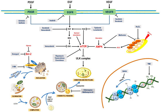 Additionally, metformin has been reported to increase the expression of AMPK while inhibiting the expression of mTOR, leading to cell death in glioma models [80]. In a different approach, it has been reported that specific antigens, such as the melanoma antigen-6 (MAGE) are related with the degradation of the tumor-suppressing protein AMPK; when MAGE is knocked-out, AMPK activity is restored, and mTOR is inactivated, leading to cell death by autophagy [81].