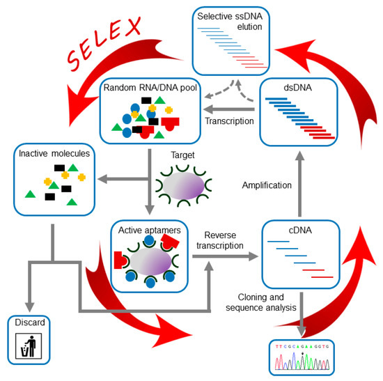 It was in 1990 that two independent publications from the groups of Jack Szostack and Larry Gold set the basis for the development of the currently known aptamer technology [4,5]. The group of Jack Szostak described the isolation of short RNA oligonucleotides that were able to efficiently bind to organic dyes. They coined the term aptamer to name these binder molecules [4]. On the other hand, the principles of the general strategy for the selection of aptamers that is known as SELEX were defined by the Larry Gold’s group. SELEX stands for systematic evolution of ligands by exponential enrichment [5]. Aptamers are defined as short oligonucleotides, DNA and RNA, that exhibit extraordinary binding efficiency to a specific target molecule [4]. Since then, numerous reports have described the successful identification of aptamers targeting from single molecules like ions, amino acids, nucleotides, antibiotics, etc., to macromolecules like peptides, proteins, or nucleic acids, and even targeting viruses and full cells [6,7,8,9,10,11,12,13,14].