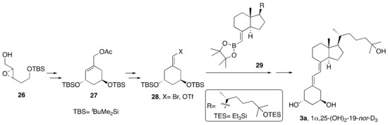 Nagasawa’s group described [17] a new synthetic method to obtain A-ring synthons 28 (Scheme 5) based on ring-closing metathesis from a linear precursor, and then they applied it to synthesize 1α,25-(OH)2-19-nor-D3 (3a). This strategy enabled the preparation of an A-ring with a more flexible substitution pattern. For the synthesis of A-ring precursors 28 they chose cyclohexene 27 as an intermediate, which was obtained from the corresponding chiral epoxide alcohol 26, derived from 1,3-propanediol. These A-rings 28 were used to carry out the coupling with the appropriate functionalized CD-ring/side chain fragment 29 to produce 1α,25-(OH)2-19-nor-D3 (3a).