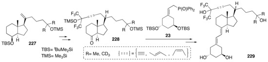 Maehr’s research group described [79,80] new Gemini analogs 229 (Scheme 45), which consisted of derivatives with two different side chains emanating from C20. The first part of the syntheses involved the preparation of CD-ring synthons and commenced with the previously described Inhoffen–Lythgoe diol, which was transformed into compounds 227. Subsequent reactions led to the ketones 228, which served as suitable coupling partners with the A-ring synthon 23. The second phase of the synthesis included the coupling reactions of the CD-ring moieties 228 with the A-ring precursor 23 using Wittig–Horner conditions. These analogs, featuring 23-yne and 23(E) side-chains, were more active in human breast cancer cell growth inhibition and human leukemia cell differentiation induction than their 23(Z)-counterparts.