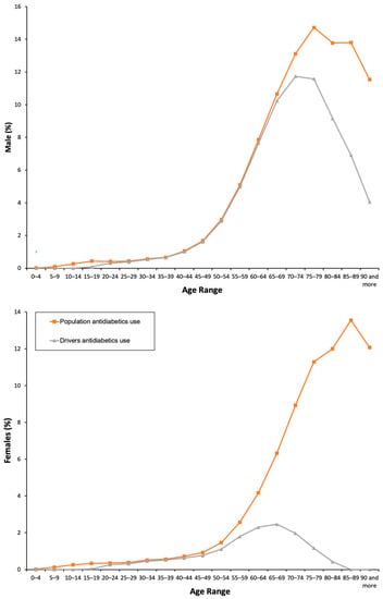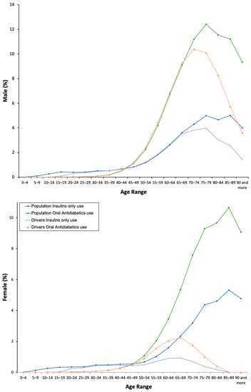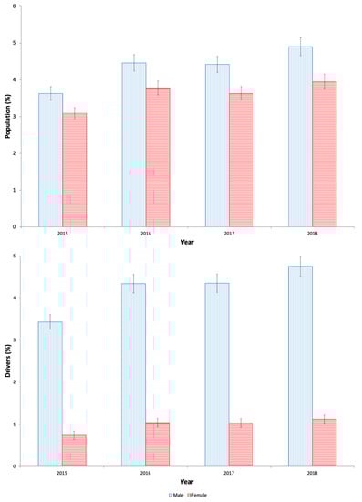 | Gender | Population Using Antidiabetics % (95CI) | Drivers Using Antidiabetics % (95CI) | ||||||
