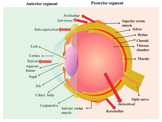 The detailed anatomical structure of the eye and its routes of administration are presented in Figure 1. The anatomical structure of the eye is composed of two parts, i.e., anterior segment and posterior segment [15,16,17,18,19]. Paracellular and transcellular are the two routes for penetration of drugs into the corneal epithelium. The penetration of lipophilic molecules predominantly involves transcellular mechanisms, however, hydrophilic molecules and ions involve the paracellular route [19].