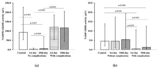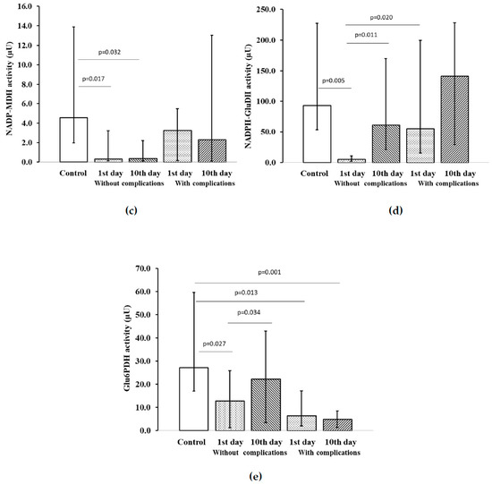Activity of NADP-dependent platelet dehydrogenases in patients with ACS and ADD, depending on the development of complications: (a) NADP–GluDH activity; (b) NAD–ICDH activity; (c) NADP–MDH activity; (d) NADPH–GluDH activity; (e) Glu6PDH activity. Notes: Values expressed as median and interquartile range in the form of 25 and 75 percentiles, p < 0.05 was considered statistically significant. Wilcoxon matched-pairs rank test for patients without complications on the 1st vs. 10th day of the examination and for patients with complications on the 1st vs. 10th day of the examination. Mann–Whitney U test for patients vs. control subjects and for patients with complications vs. patients without complications. Notes: µU—microunit.