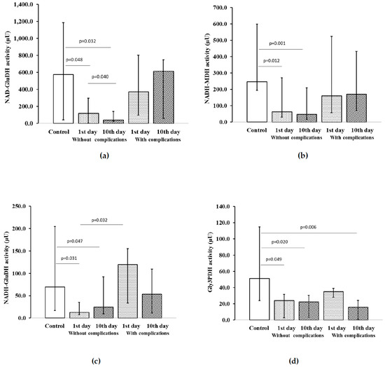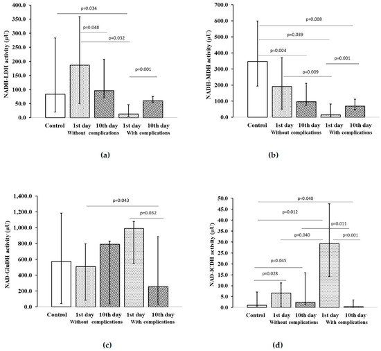 Activity of NAD-dependent platelet dehydrogenases in patients with ACS without ADD, depending on the development of cardiovascular complications: (a) NADH–LDH activity; (b) NADH–MDH activity; (c) NAD–GluDH activity; (d) NAD–ICDH activity. Notes: Values expressed as median and interquartile range in the form of 25 and 75 percentiles, p < 0.05 was considered statistically significant. Wilcoxon matched-pairs test for patients without complications on the 1st vs. 10th day of the examination and for patients with complications on the 1st vs. 10th day of the examination. Mann–Whitney U test for patients vs. control subjects and for patients with complications vs. patients without complications. Notes: µU—microunit.