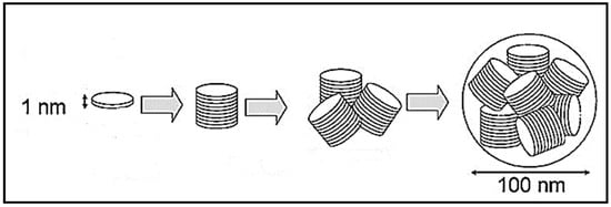 Laponite® (LP), Na0.7[(Si8Mg5.5Li0.3)O20(OH)4], is a synthetic analogue of a naturally-occurring smectite clay, hectorite [9,10,11]. Its crystal structure comprises a 2:1 layered system whose principal repeating unit is an octahedral magnesium oxide sheet bound between two tetrahedral silicate sheets, which are stacked to form nanodiscs measuring approximately 25 nm in diameter and 1 nm in height (Figure 1) [12]. The partial substitution of Mg2+ for Li+ within the octahedral magnesia layers confers a negative charge on the lattice that is balanced by ion-exchangeable interlayer Na+ ions [13]. Water molecules are also present within the interlayer spacing. Under selected conditions, the individual 2:1 silicate-magnesia-silicate layers can be entirely exfoliated (i.e., delaminated) into individual discs or expanded to accommodate large neutral or cationic species [14].