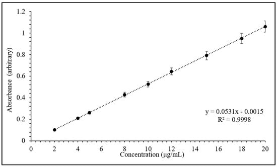 In this study, the drug content was monitored at 270 nm by UV-vis spectroscopic analysis using a calibration curve, as presented in Figure 2. The calibration curve is linear in the concentrations between 2 and 20 µg/mL, with a correlation coefficient (R2) of 0.9998 (as shown in Figure 2).