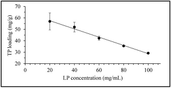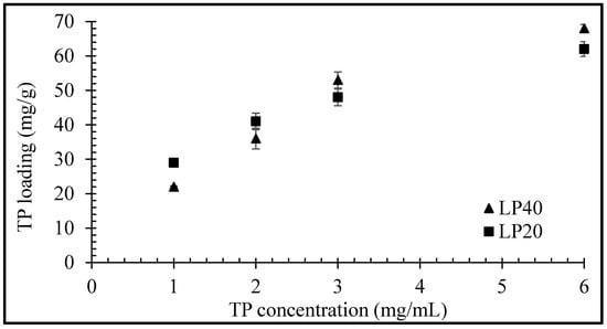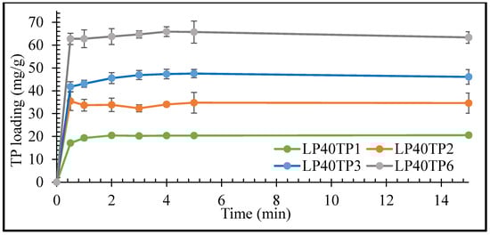 Uptake kinetics of TP by LP with 40 mg/mL LP. Values expressed are means with standard deviations as error bars, n = 3.