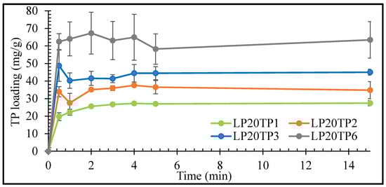 Uptake kinetics of TP by LP with 20 mg/mL LP. Values expressed are means with standard deviations as error bars, n = 3.