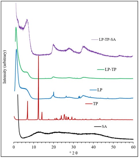 Diffractograms of sodium alginate (SA), TP, LP, LP-TP and LP-TP-SA.