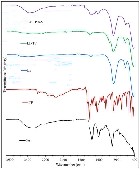 ATR-FTIR spectra of TP, LP, LP-TP and LP-TP-SA.