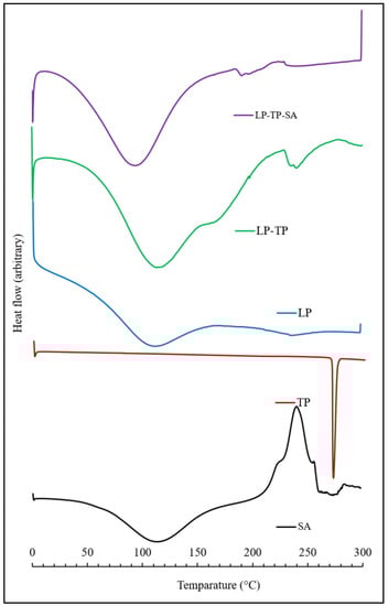 Thermograms of SA, TP, LP, LP-TP and LP-TP-SA.