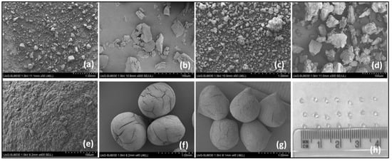 Secondary electron images of (a,b) LP, (c,d) LP-TP, (e) LP-TP-SA bead surface, (f,g) LP-TP-SA dried beads, and (h) digital photograph of LP-TP-SA beads.