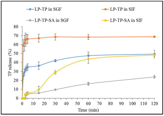 Dissolution profiles of TP from LP-TP and LP-TP-SA. Values expressed are means with standard deviations as error bars, n = 3.
