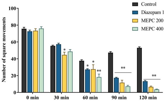 The locomotor activity of MEPC was assessed by the open field test according to the previously described method of Gupta et al. (1971) [89]. A four-sided box with a measurement of 60 × 60 × 60 cm3 with 25 equal squares (5 × 5 cm2), which alternatively highlighted in black and white. The dosing of each group was followed, as described in Section 3.5. Immediately after the treatment, each mouse was individually placed in the apparatus for 3 min at 0, 30, 60, 90 and 120 min intervals, where the number of squares moved was recorded.
