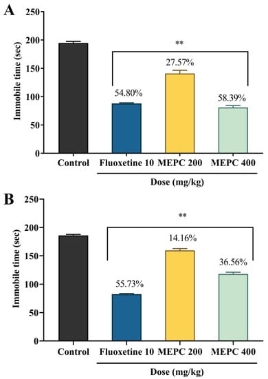 The antidepressant activity of MEPC and standard drug fluoxetine was evaluated by forced swimming test by previously described protocol [90]. The FST assessed in a transparent glass beaker (25 × 15 × 25 cm3) which occupied with water (25 ± 1 °C) up to 15 cm. The dosing of each group was followed, as mentioned in Section 3.5. Thirty minutes after the administration, each mouse was individually placed in the apparatus for forced swimming. The study conducted for 6 min, where the first 2 min was used for initial adjustment and the last 4 min was considered as the immobility time.