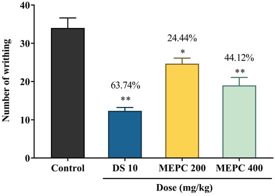 The acetic acid-induced writhing test was used for the evaluation of the antinociceptive activity of MEPC by the previously described method [92]. The treatment followed the process, as mentioned in Section 3.5. Thirty minutes after the administration, 0.7% acetic acid (v/v) was injected in the intraperitoneal route of mice. The total writhing by each mouse was recorded for 15 min. Following equation was used to evaluate the percentage of inhibition: