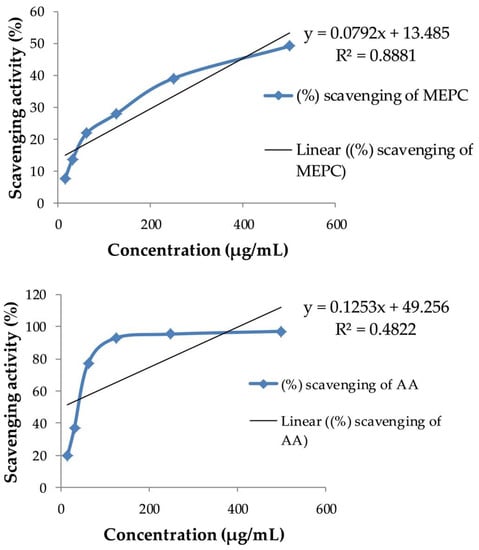 Reactive oxygen and nitrogen species are chemical species that incorporate radical and non-radical oxygen species formed by the decrease of oxygen (H2O2, HO•, NO• and ONOO¯) [58]. The source of ROS/RNS is oxidative phosphorylation in mitochondria by the leaking of electron that generates free oxygen radicals [58,59]. Moderate concentrations of ROS play vital roles in numerous biologic processes (cell cycle regulation, phagocytosis, gene expression and cell signaling), whereas excess production can be lead to severe pathologic damages. In particular, increased concentrations of ROS led to OS, which is required to neutralize and detoxify byproducts and biologic system [59,60,61,62]. Inside the body, antioxidants act to inhibit the reactions among free radicals and biologic substances by interrupting the reaction of radical oxidation [63]. Various techniques are utilized to assess the radical-scavenging activity of antioxidants. DPPH-scavenging strategy is a favored technique since it is quick, simple and reliable. DPPH is a steady, synthetic radical that does not break down in water, methanol or ethanol. The free radical-scavenging activity of plant extracts rely upon the capacity of compounds to release hydrogen and the basic conformation of these compounds [64]. In our present study, the DPPH radical-scavenging assay of MEPC and ascorbic acid was presented in Figure 6. The inhibitory concentration (IC50) of MEPC was 461.05 µg/mL, whereas for the standard drug ascorbic acid showed 5.94 µg/mL (Table 3). MEPC and ascorbic acid exhibited a concentration-dependent radical-scavenging activity where 49.06% and 97.05% highest scavenging activity was observed by 500 µg/mL dose of ascorbic acid and MEPC, respectively.