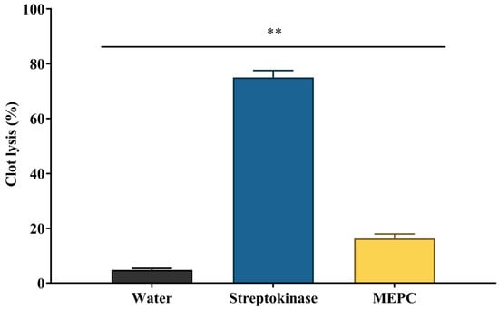The evaluation of thrombolytic activity is a significant finding, which may be implicated in cardiovascular-related problems in health. Thrombolysis is the breakdown of clots in blood by drugs where the plasmin (fibrinolytic agent) breakdown the clot that contained as fibrinogen and fibrin [68]. The streptokinase (SK) is additionally used to break down plasminogen to plasmin. This kind of drugs is developed from the Streptococcus species, or, utilizing the recombinant biotechnology [69]. However, there are a few thrombolytic drugs available with lesser side effects which lead the researcher to develop new drugs from natural sources [70]. There are few drugs developed from the natural sources which exert thrombolytic effects, for example, A. sativum [71] F. arabica [72] and C. sinensis [73]. In the present study, the MEPC and streptokinase showed 16.33% and 75% (p < 0.001) clot lysis activity, respectively in comparison with the control (4.84%), as shown in Figure 7.