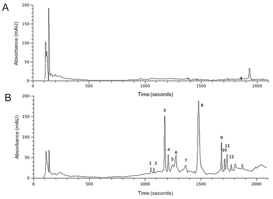 HPLC profiles at 280 nm of the H. incurva ethanol extracts. The peaks in HIE/m (A) and HIE/n (B) are labeled according to Table 2.