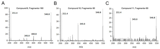 The isotopic distribution of bromine ions allows the mass spectra of molecules containing these atoms to show diagnostic clusters [37]. Some molecules detected in the HIE/n sample showed fragmentation patterns indicating the presence of bromine atoms. Compounds 3 and 4 were tentatively identified as two isobaric monobromopnehonls with a typical cluster for the [M-H]– ions at m/z 347 and m/z 345, both at the same intensity, and the species at m/z 267 produced by the loss of 80 Da attributable to a bromine atom. Compound 8 can be tentatively identified as 3 bromo, 4,5 dihydroxyphenyl methanol, previously detected in the red algae [36]. The three isobaric compounds 9, 10 and 11 showed the same UV-Vis spectrum and a typical fragmentation pattern, which suggested the presence of two bromine atoms in their structure (Figure 3). Several monobromo- and dibromophenols have been previously detected in red and green seaweeds [35,36]. As for compound 9, the maximum intensity of the [M-H]– ion at 547 m/z was obtained with fragmentor at 160 V, conversely, for compounds 10 and 11 the maximum intensity of [M-H] – ion was reached by applying a lower energy for fragmentation (80 V). For all the isobars, the ion clusters at 465 and 467 m/z indicated the loss of a bromine atom and the species at 401 and 403 m/z were attributable to a moiety containing a bromine atom that originated the ion at 321 m/z after the loss of 80 Da. All the mass spectra of the three isobars showed the presence of a non-halogenated fragment at m/z 211.