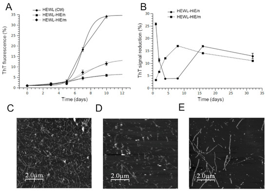 Effect of the HIEs on the HEWL amyloid aggregates formation. (A) Kinetic plots followed by ThT fluorescence signals. Plots report the ThT fluorescence signals at different times with respect to that at 0 days. (B) ThT competition assay. Preformed HEWL fibrils were incubated with ThT dye in the presence of HIE/m or HIE/n. (C–E) Representative AFM morphological analysis images showing the quantitative and qualitative differences in the HEWL fibrils’ formation at 10 days of incubation of HEWL alone (C) or in the presence of HIE/m (D) or HIE/n (E).