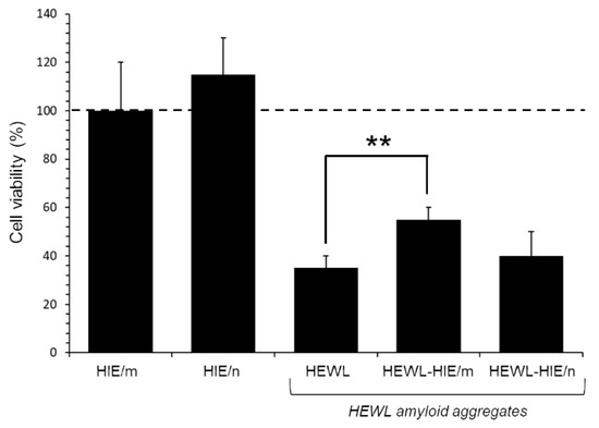 Effect of HIEs on cytotoxicity induced by HEWL aggregates on SH-SY5Y cells. Cells were treated for 48 h with HEWL aggregates formed for 4 days in the absence or presence of HIE/m or HIE/n. Data are reported as percentage values with respect to the untreated control cells (represented by the dotted line) and expressed as the mean ± standard deviation of at least three independent experiments of three independent extractions. Error bars represent standard deviations. Statistical significance was performed using T-test: **: p-Value < 0.01 vs. the untreated control cells.