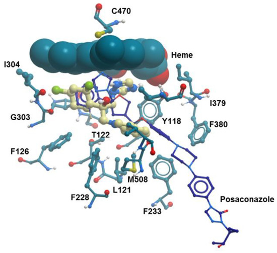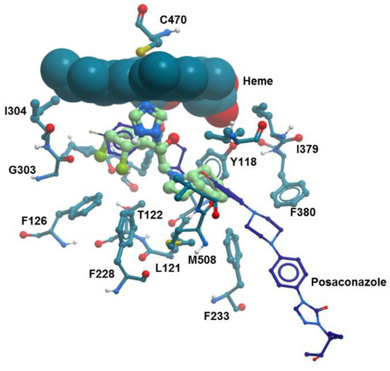 - Hargrove, T.Y.; Friggeri, L.; Wawrzak, Z.; Qi, A.; Hoekstra, W.J.; Schotzinger, R.J.; York, J.D.; Guengerich, F.P.; Lepesheva, G.I. Structural analyses of Candida albicans sterol 14 alpha-demethylase complexed with azole drugs address the molecular basis of azole-mediated inhibition of fungal sterol biosynthesis. J. Biol. Chem. 2017, 292, 6728–6743. [Google Scholar] [CrossRef]
