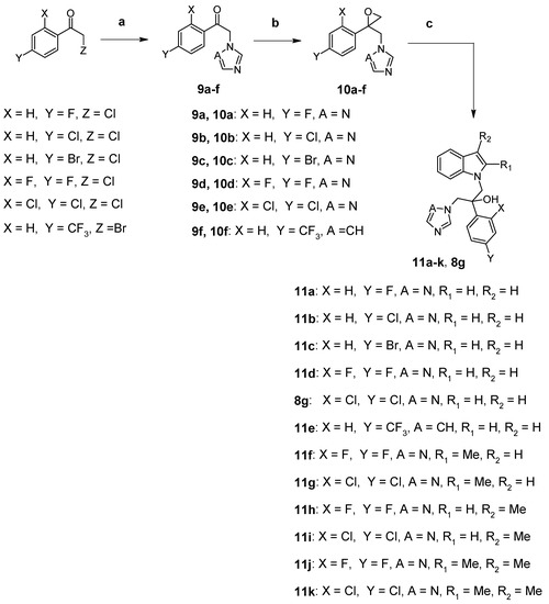 - Na, Y.M.; Le Borgne, M.; Pagniez, F.; Le Baut, G.; Le Pape, P. Synthesis and antifungal activity of new 1-halogenobenzyl-3-imidazolylmethylindole derivatives. Eur. J. Med. Chem. 2003, 38, 75–87. [Google Scholar] [CrossRef]