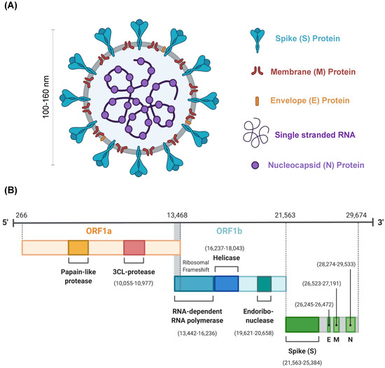 SARS-CoV-2 virus structure and genome. (A) Structure of SARS-CoV-2 virus including membrane (M), spike (S), envelope (E), and nucleocapsid (N) proteins, and single stranded RNA. The size of the virus is reported to be 100–160 nm. (B) The genomic structure of SARS-CoV-2 depicting open reading frames (ORF1a and 1b) with nonstructural proteins like 3CL protease, RNA dependent RNA polymerase (RdRp), helicase, endoribonuclease, and four structural proteins (S, M, E and N).
