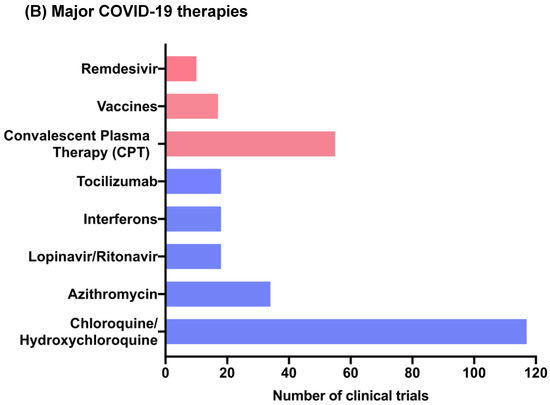 Approximately 1265 clinical trials related to COVID-19 are registered [23], including diagnostic tests, devices, and treatment strategies against SARS-CoV-2 (Figure 2A). Some 447 clinical trials are ongoing to evaluate novel therapeutic modalities, repurposed antivirals (lopinavir/ritonavir/ ribavirin), antimalarial (hydroxychloroquine), and anti-inflammatory drugs for treating SARS-CoV-2 infection. Also, 143 biologicals are at different stages of clinical trials, including seven vaccine candidates (Figure 2B). This review is centered on providing an inclusive update on the aforementioned therapeutic interventions for treating COVID-19.