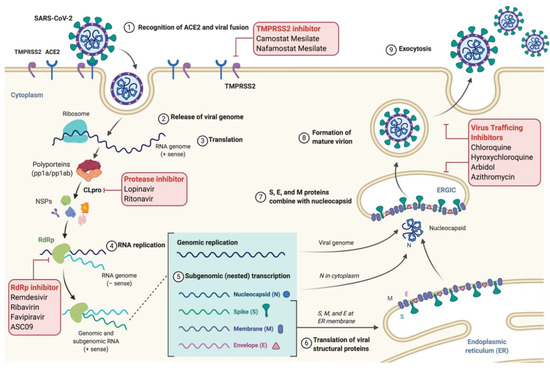 Graphical abstract depicting the SARS-CoV-2 replication cycle and site of action for widely studied drugs against COVID-19. (1) The virus enters the host cell by recognizing the ACE2 receptor via spike glycoprotein which induces membrane fusion, resulting in (2) release of viral genome in the cytoplasm. (3) The viral RNA undergoes translation to form polyproteins, which are then cleaved by the viral protease enzyme (CLpro) to form nonstructural proteins like RdRp for replication of viral RNA. Positive sense of viral RNA then undergoes translation to form structural proteins (N, S, M, and E) where S, M, and E are processed in ER (6), while N protein is processed in the cytoplasm where it assembles with a viral RNA replicon. All components are then combined inside the ER-golgi intercompartment (ERGIC) (7), from which virions are released inside the vesicles (8) and secreted outside the cell via exocytosis (9). ACE2: Angiotensin Converting Enzyme 2; TMPRSS2: Type 2 Transmembrane Serine Protease; NSPs: Non-structural proteins; RdRp: RNA dependent RNA polymerase; and CLPro: Coronavirus Protease.