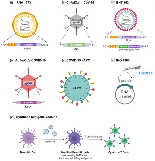 Vaccine candidates currently in clinical trials for COVID-19. (i) mRNA 1273 is a mRNA-based vaccine, which encodes the full-length S protein of SARS-CoV-2 virus and is delivered via lipid nanoparticles (LNPs). (ii) ChAdOx1 nCoV-19 is a chimpanzee adenovirus vector, which expresses the S protein of SARS-CoV-2 virus inside the host cells and activates the immune system. (iii) BNT 162 is a mRNA-based vaccine delivered via LNPs with four candidates (BNT162a1, BNT162b1, BNT162b2, BNT162c2), encoding either the S protein or receptor binding domain (RBD) of S1 subunit. (iv) Ad5-nCoV COVID-19 is a replication defective adenovirus 5 vector (Ad5) encoding the full-length S protein of SARS-CoV-2 virus. (v) COVID-19 aAPC are artificial antigen-presenting cells (aAPC) modified using a lentivirus vector to express fragments of SARS-CoV-2 proteins and immunomodulatory genes. (vi) INO 4800 is a plasmid DNA encoding SARS-CoV-2 proteins and delivered via electroporation using the smart device Cellectra® developed by Inovio. (vii) Synthetic Minigene Vaccine or LV-SMENP-DC are genetically modified dendritic cells (DCs) via a lentivirus vector to express SARS-CoV-2 minigenes (SMEN) and immunomodulatory genes, administered via subcutaneous injection. Furthermore, T cells activated using the modified dendritic cells are also administered via intravenous infusion.