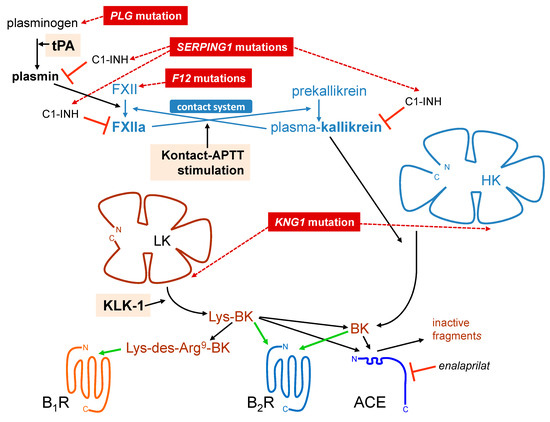 BK-mediated AE is a rare acquired or hereditary condition involving localized edema of subcutaneous and submucosal tissues. This group of disorders may be life-threatening (e.g., via suffocation), very painful and incapacitating. The mechanism is mast-cell independent and differential diagnosis must exclude various allergic or urticarial conditions that are much more frequent [13]. The most common cause of acquired AE is drug-induced, in the context of treatment with angiotensin-I converting enzyme (ACE) inhibitors for cardiovascular conditions [14,15]. The basis of this disorder may be an insufficient clearance of BK, as ACE is by far the major peptidase that inactivates kinins in blood/plasma/serum and in vivo [16,17,18]. However, what triggers kinin formation in affected patients is unclear [19]. Therapeutic fibrinolysis, with recombinant tissue plasminogen activator (tPA) or comparable plasmin activators, is associated with AE or anaphylactoid reactions. BK production initiated by plasmin-mediated FXII activation may be involved in these cases [20,21]. Non-hereditary forms of BK-mediated AE include those associated with low levels of C1-INH due to autoantibodies or overconsumption (lymphoproliferative disease) [22].