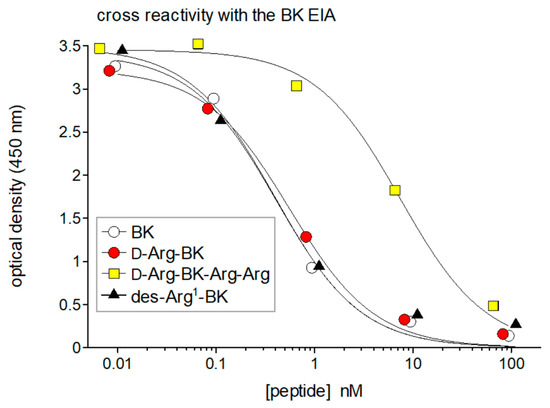 BK and related peptides are formed locally close to their site of action (autacoids). They are extremely unstable and prone to artefactual formation when blood or tissues are sampled (for instance, following contact of blood with glass). Therefore, measuring kinins in venous blood is not really informative [3], contrasting with many useful peptide hormone dosages applied in endocrinology. A further challenge in concentration determination is that the BK sequence is embedded in that of precursor kininogens, with necessary separation if an antibody-based detection system is considered. Blais et al. [3] have reviewed these pitfalls and discussed extraction procedures and recovery in the context of the currently applied immunoassays. Professor A. Adam and co-workers developed separate competitive chemiluminescence enzyme immunoassays (EIAs) for BK and des-Arg9-BK based on digoxygenin-conjugated peptides [29,30]. Now several commercially available kits are being used, such as that from Phoenix Pharmaceuticals for BK (96-well plate format), and these have the advantage of world-wide reproducibility. The sensitivity of EIAs is excellent. Typical of peptide tracers with N-terminal extensions (digoxygenin, biotin), the polyclonal anti-BK antibodies react with only a few C-terminal amino acids in the kinin sequences; thus N-terminally extended sequences like Lys-BK and Ile-Ser-BK fully cross-react in the BK EIA, but not the C-terminally truncated des-Arg9-BK [29]. Similarly, Phoenix Pharmaceuticals states that its BK EIA fully cross-reacts with Lys-BK or biotinyl-BK, but not with des-Arg9-BK. Using this assay, we observed that the N-terminally extended sequence protected from aminopeptidases, D-Arg-BK, is also equipotent with BK in the EIA, but that the C-terminally extended peptide D-Arg-BK-Arg-Arg loses much affinity, consistent with the antibody preference for an intact C-terminal BK sequence (Figure 2).