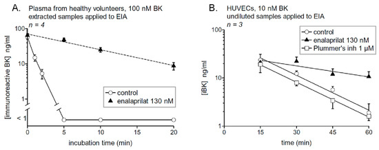 (A) Degradation of synthetic BK (100 nM) added to human plasma from healthy subjects in the presence or absence of the ACE inhibitor enalaprilat. Samples were incubated at 37 °C under agitation for the indicated time periods before extraction and EIA determination of BK. The number of replicated from different healthy donors is indicated by “n”. In the presence of the ACE inhibitor, the data are compatible with a first order decay with a half-life of 7.1 min, whereas BK was completely cleared in 5 min the absence of enalaprilat (t1/2 34 s). Reproduced from [18]. (B) Catabolism of BK, measured as [iBK], by intact HUVECs as a function of time. Values are means ± s.e.m. of 3 determinations. A first order decay model has been applied (t1/2 values reported in main text). BK added to similar wells without cells (nude plastic) was stable when incubated in an identical manner (data not shown).