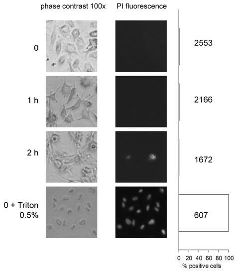 Effect of incubation under agitation in Hank’s balanced salt solution containing BK (500 nM) on adherent HUVECs (matched phase contrast and red fluorescence fields, original magnification 100×). Propidium iodide (PI) staining was performed as a test of viability (positive control, Triton X100, 0.5%). Total counted cell numbers are given next to the histograms.